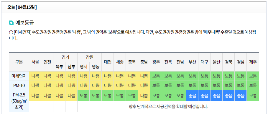 4월 15일 : 서울 인천 경기 충청권 나쁨 전라도 경상도 제주도 좋음